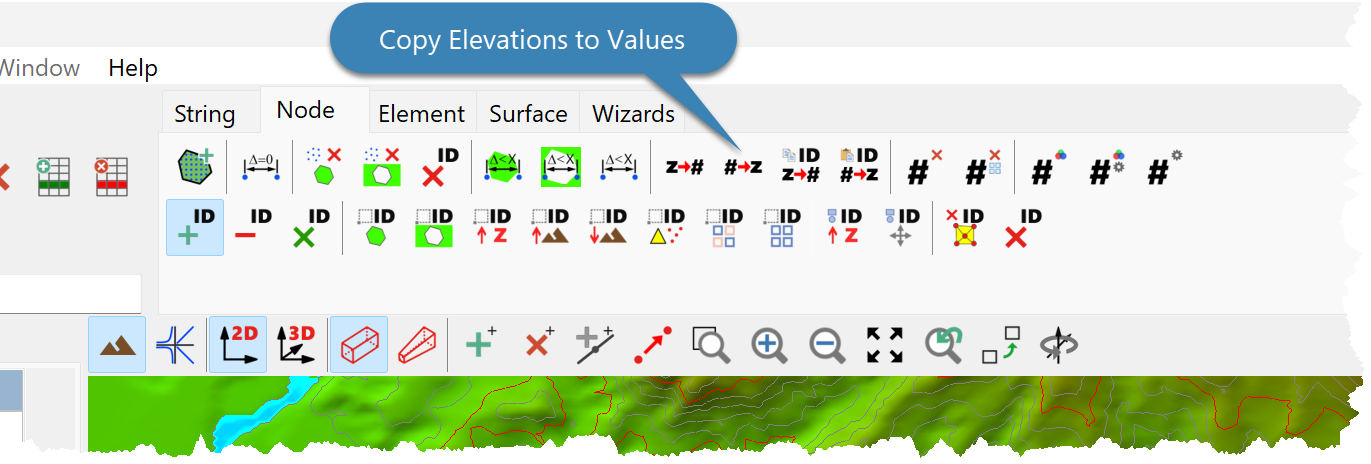 •Click Surface > Nodes > Values > Copy Elevations to Values; or